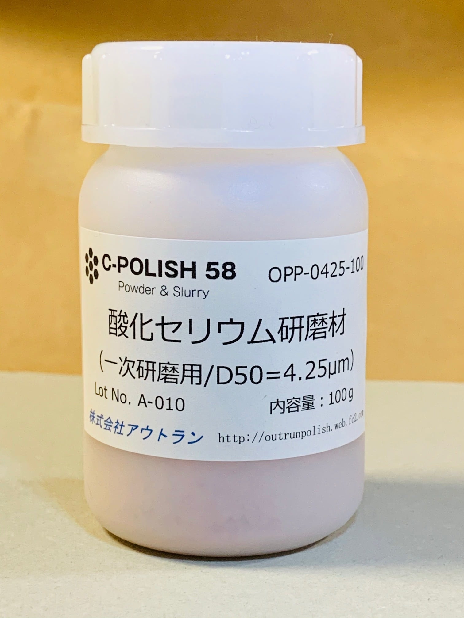 酸化セリウム研磨材パウダータイプ。一次研磨用・樹脂容器入り。